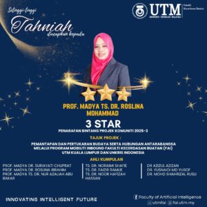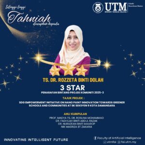 - FAI terlibat aktif dalam penulisan melibatkan SDG (Cth: FB FAI, UTM NewsHub/Buletin/majalah PTJ/rencana, artikel, cerpen, buku, jurnal, laporan, tajuk buku, buletin, poster, konvensyen antara kolej dan universiti)