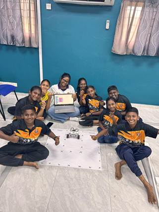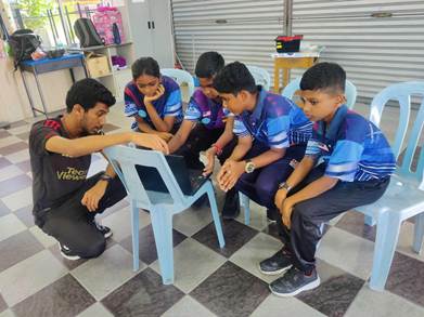 Caption: Students at SJKT Batu Caves work in teams to build robots, exploring the basics of programming and design.