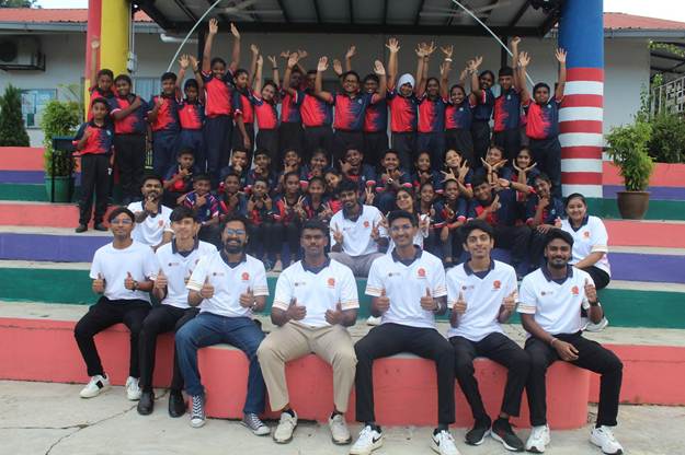 The program began at SJKT Batu Caves, engaging over 50 students with six robotics activity stations. Students explored basic robot movements, sensor applications, and robotic arms before competing in a final race challenge where they designed their own EV3 robots.