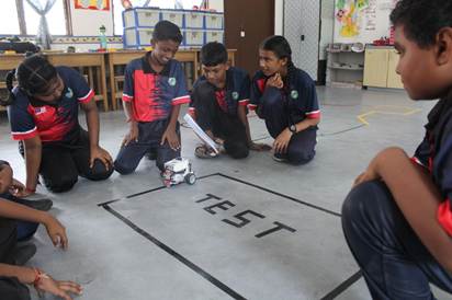 Caption: Several teams of students at SJKT Bukit Darah test their robots on the designated track as part of the robotics activity
